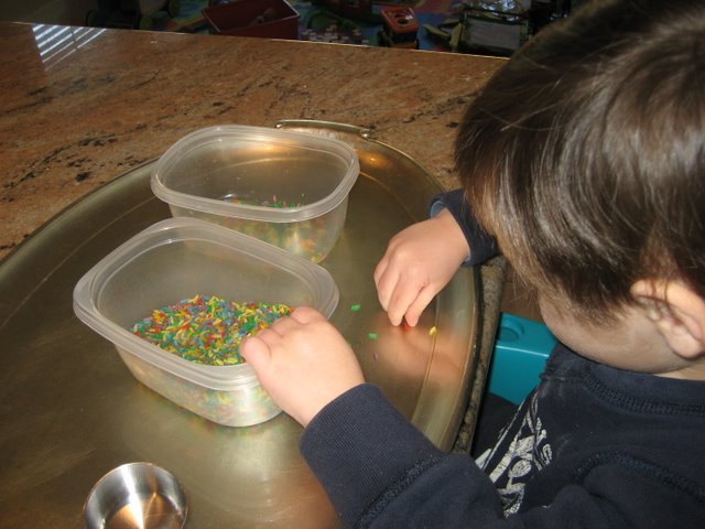 * Have your assistant help carefully add food coloring to the rice. I let Turbo hold the bottle, then put my hand over his to help him squeeze and for quick removal if necessary. There's no pictures of this (obviously)! We used this opportunity to count drops. It helped him remember to squeeze slower so he could see them.